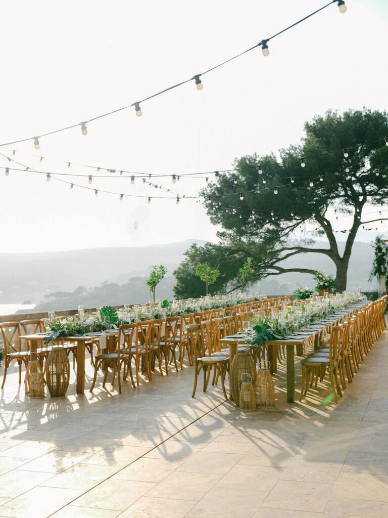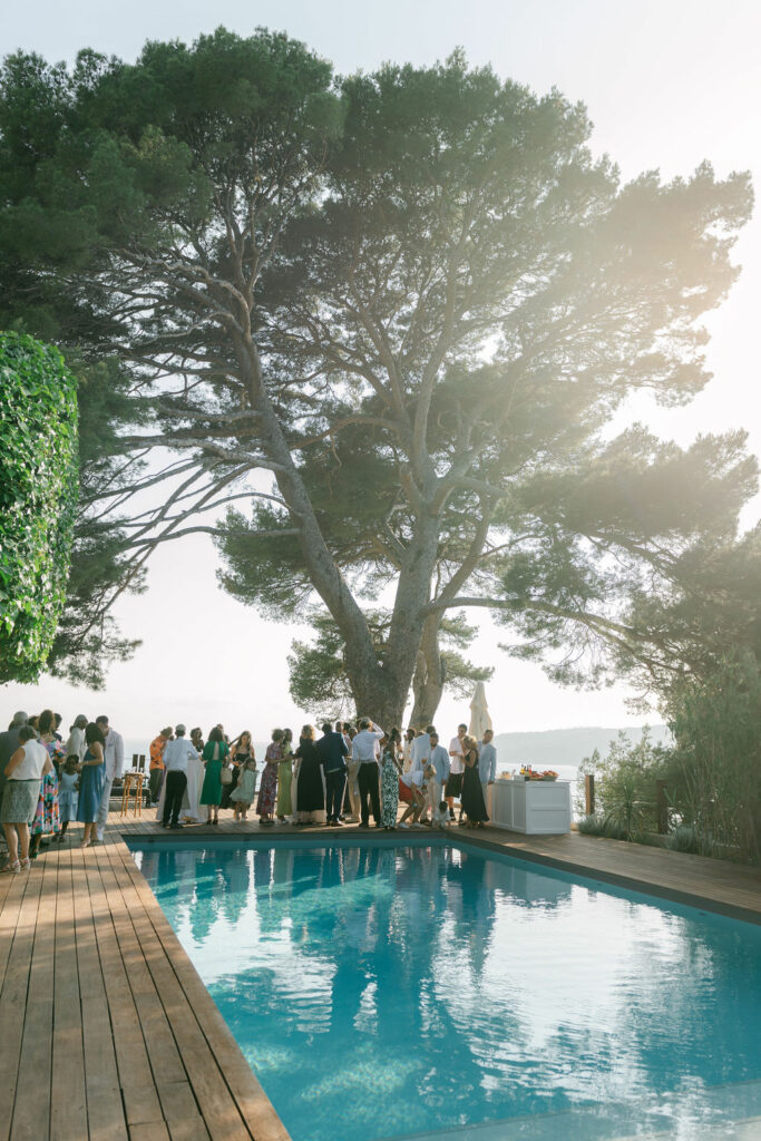 L’atmosphère du mariage se voulait naturelle, lumineuse et profondément ancrée dans l’art de vivre du Sud de la France. Les invités ont profité d’un cocktail décontracté autour de la piscine avant de rejoindre un dîner élégant en plein air, entourés par la nature et la mer. Au coucher du soleil, l’ambiance est devenue magique, chaleureuse et résolument festive.