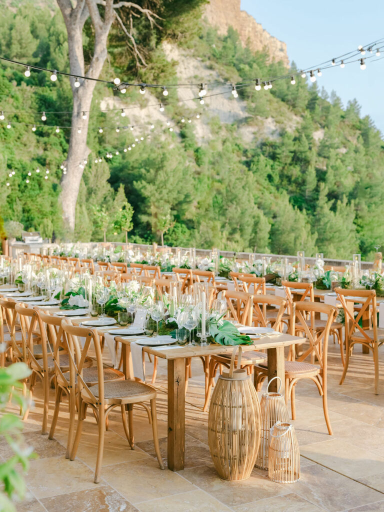 L’un des principaux défis de ce mariage a été de transformer l’espace de cérémonie en lieu de dîner sur une seule et même terrasse. Pendant que les invités profitaient du cocktail au bord de la piscine, nos équipes ont réalisé un changement de décor complet en un temps record. Une transformation fluide et spectaculaire qui a créé un véritable effet waouh à la découverte du dîner au coucher du soleil.