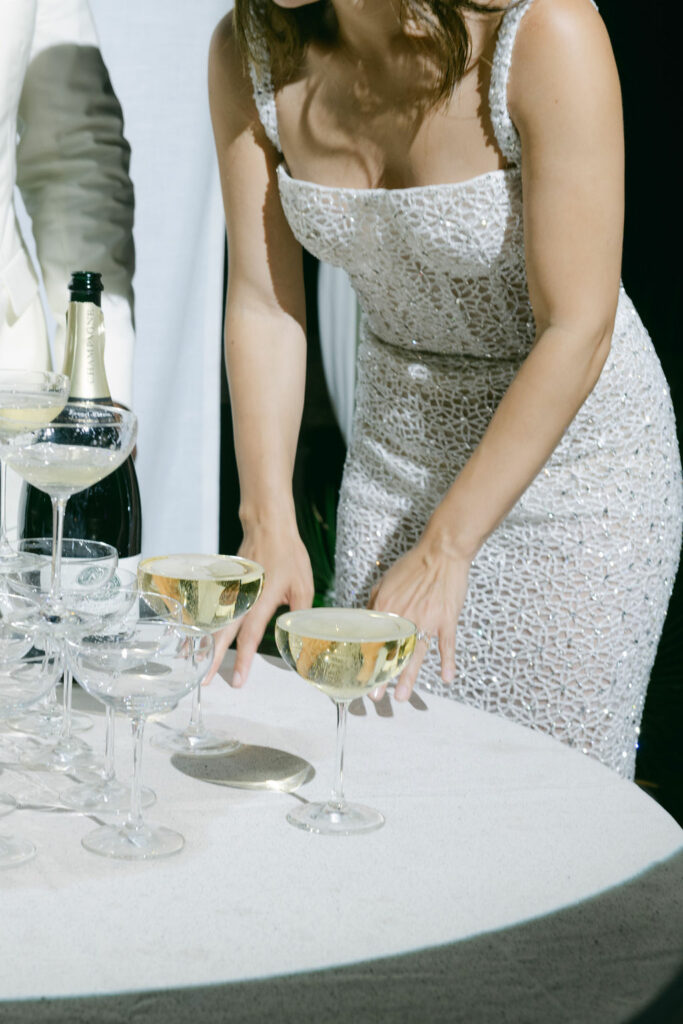 La mise en beauté d’Anneliese a évolué tout au long de la journée, trouvant l’équilibre parfait entre élégance et modernité. Pour la soirée, elle a surpris ses invités en apparaissant dans une seconde robe ornée de perles, sublimée par une coiffure à l’effet wet assumé. Une transformation audacieuse incarnant la confiance, la modernité et l’esprit d’une mariée contemporaine en mariage de destination.