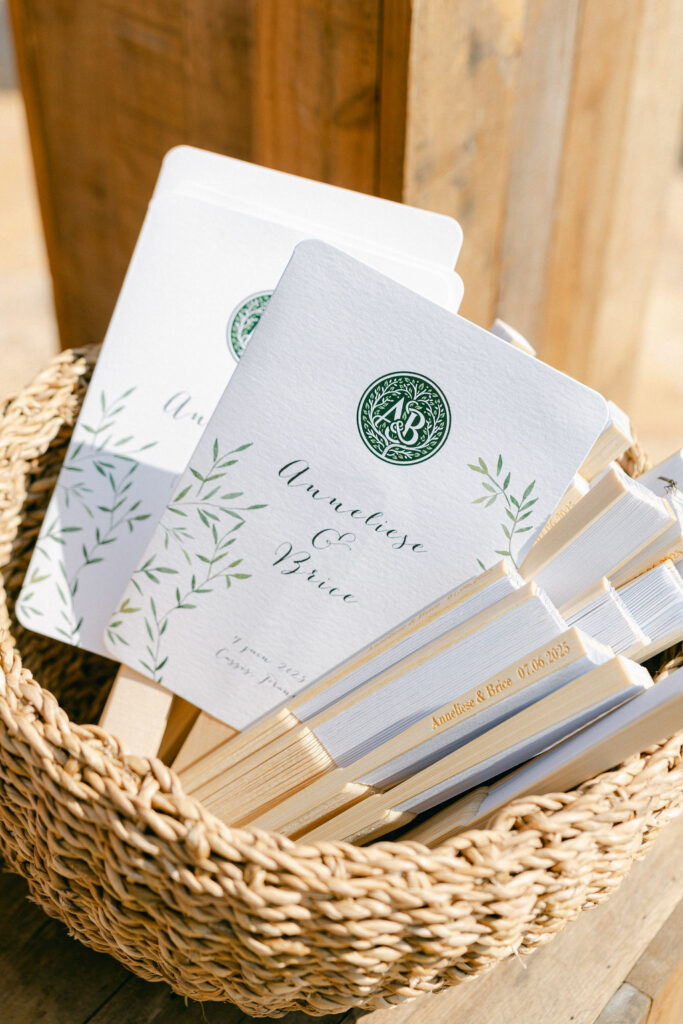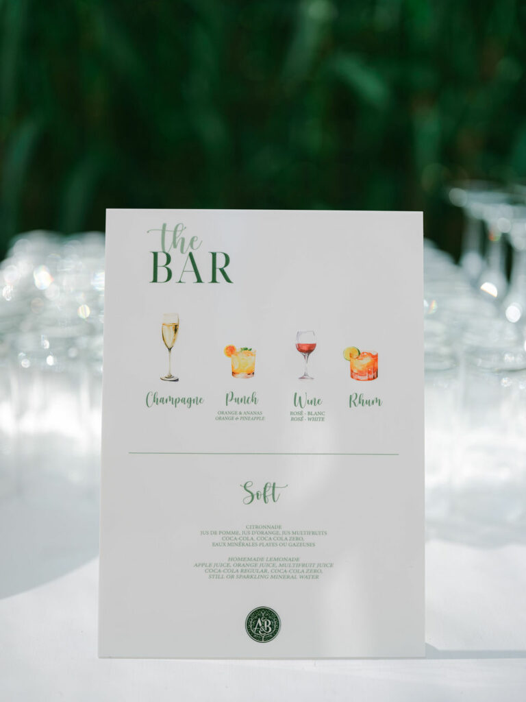 La décoration a été pensée comme une continuité du paysage, mêlant compositions florales verdoyantes et textures organiques. La papeterie sur-mesure faisait écho à cet univers botanique, tandis qu’un plan de table XXL imprimé sur tissu s’est imposé comme un véritable élément signature. Chaque détail reflétait un luxe subtil et une élégance intemporelle.